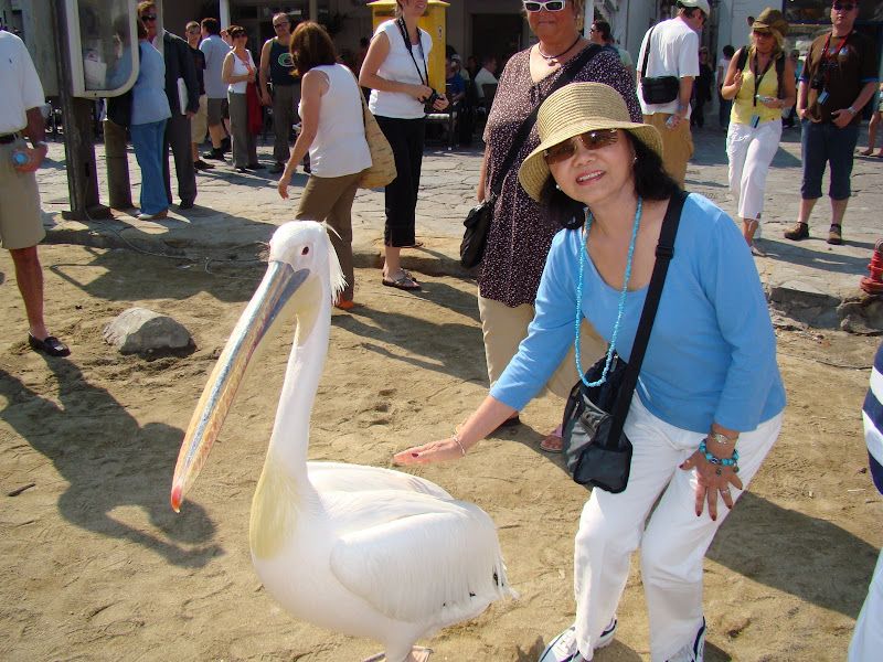 Chúa đảo Mykonos đến chào mừng tôi và người tình trăm năm tại bến tàu. Thật dể thương. Một con chim Pelican màu trắng tên Petros là biểu tượng của đảo Mykonos trong suốt 50 năm.