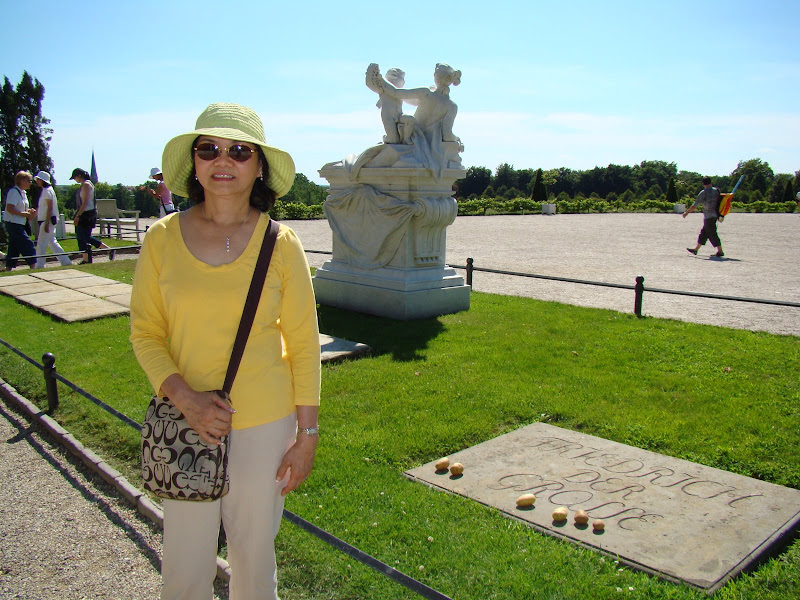 Phải 200 năm sau, khi nước Đức được thống nhất và tự do, dân Đức mới thực hiện được di chúc nây của đại đế của họ. Hai vợ chồng tôi đả đến chụp hình kỷ niệm tại ngôi mộ lạ thường nầy.