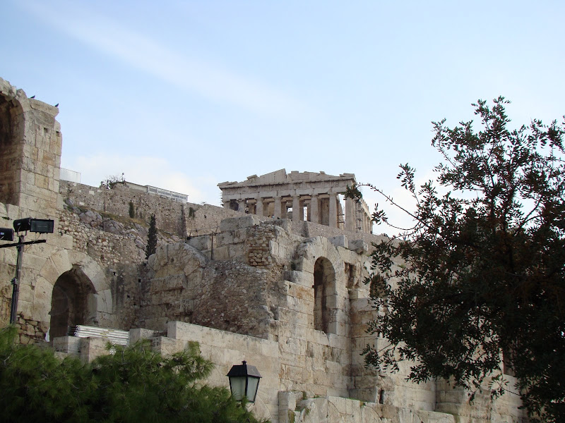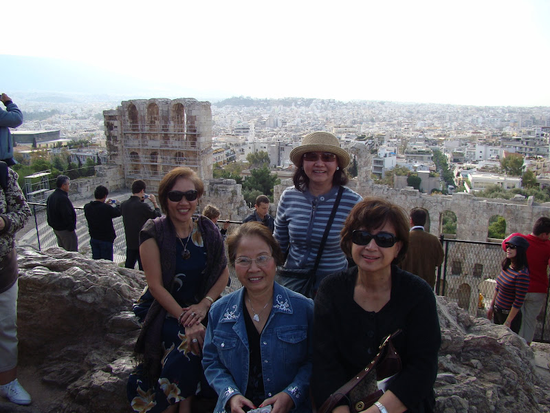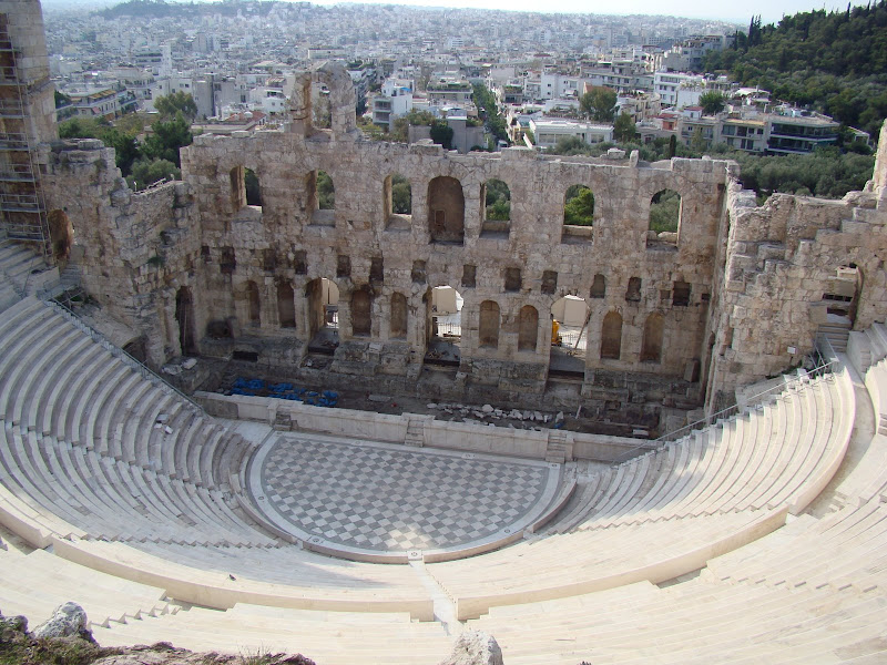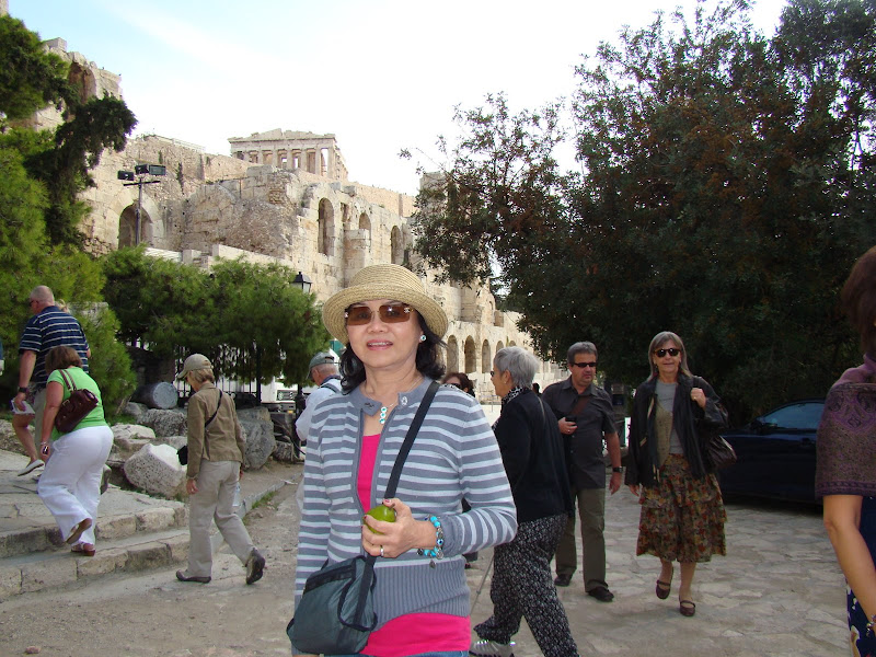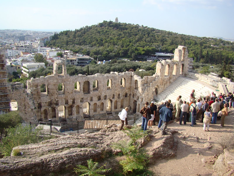 (Trên đường leo núi, nhóm Việt Nam chúng tôi dừng chân tham quan rạp hát ngoài trời Herold Atticus, được xây cất thế kỷ thứ 4 trước Thiên chúa, và được người La Mả xây lại thế kỷ thứ 2 sau Thiên chúa. Nguyên thủy những vở kịch của Sophocle và Aristophanes đã được trình diễn tại đây. Thời kỳ La Mã đô hộ, họ đã tổ chức những trận đấu gladiator tại đây. Hiện rạp hát ngoài trời này vẫn còn được sử dụng để trình diễn ca nhạc.)