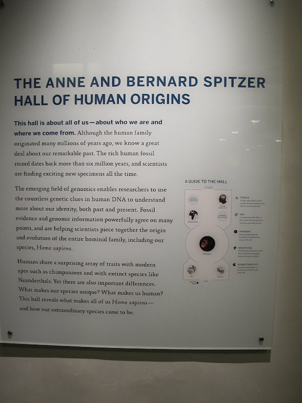 Bảo tàng viện này có 46 gian trưng bày. Hôm nay xin giới thiệu với các bạn một phòng triển lãm về nguồn gốc con người, trưng bày nhũng chứng tích về sự phát triển của ông cha chúng ta mấy triệu năm trước tới sự xuất hiện của "homo sapiens", nhân loại chúng ta ngày hôm nay. Phòng triển lãm Spitzer Hall phối hợp những khám phá của xương hóa thạch(fossils) với những tiến bộ của khoa học di truyền (genomics science), thú vị lắm.